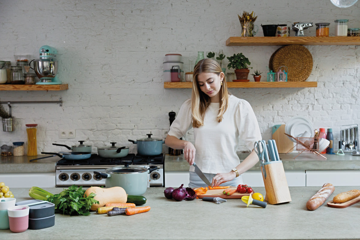 Want to brighten up your kitchen with a touch of color? This 7-piece knife block is a subtle way to add style and hue to your worktop. The set includes a versatile range of knives — paring, utility, carving, bread, chef’s, and Santoku. The beautifully designed wooden block with a glossy top finish keeps your knives neatly organized and within reach for efficient prep. Knife slots are shaped to perfectly fit each knife’s bolster, ensuring safe storage. A strong integrated magnet on the side offers convenient storage for scissors or other magnetic kitchen tools.