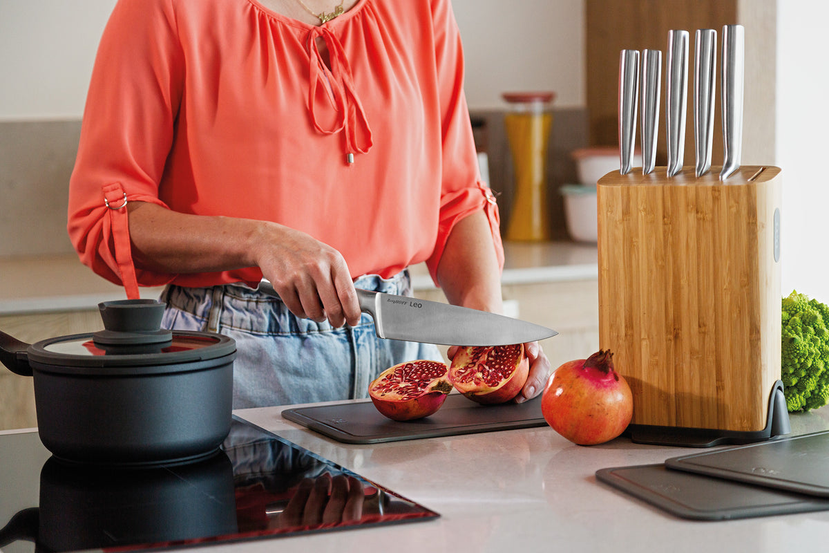 This chef's knife is made of high-quality stainless steel that not only stays sharp for a long time, but is also very easy to maintain. It features a seamless transition from the stainless steel blade to the matching stainless steel handle. The hollow handle ensures a comfortable, ergonomic grip to slice meat or vegetables with precision. This knife is part of an all-in-1 knife block with an integrated knife sharpener and accompanying cutting boards.