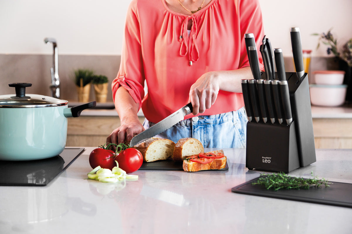 Make quick work of the most crusty breads as well as the most delicate tomatoes with this stainless steel bread knife. The well-balanced knife is a pleasure to use and makes the thinnest slices for a clean-cut result. Its serrated stainless steel blade saws effortlessly through the tough crust without affecting the finished slice of the loaf.