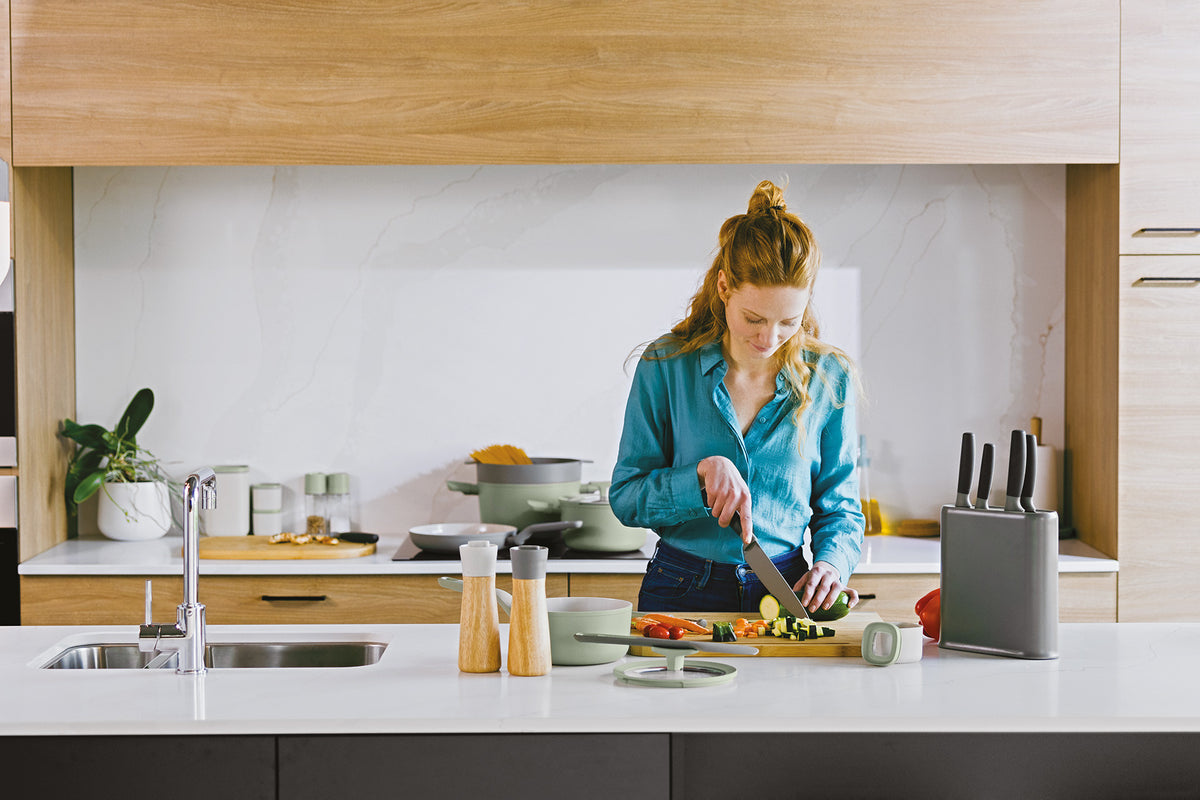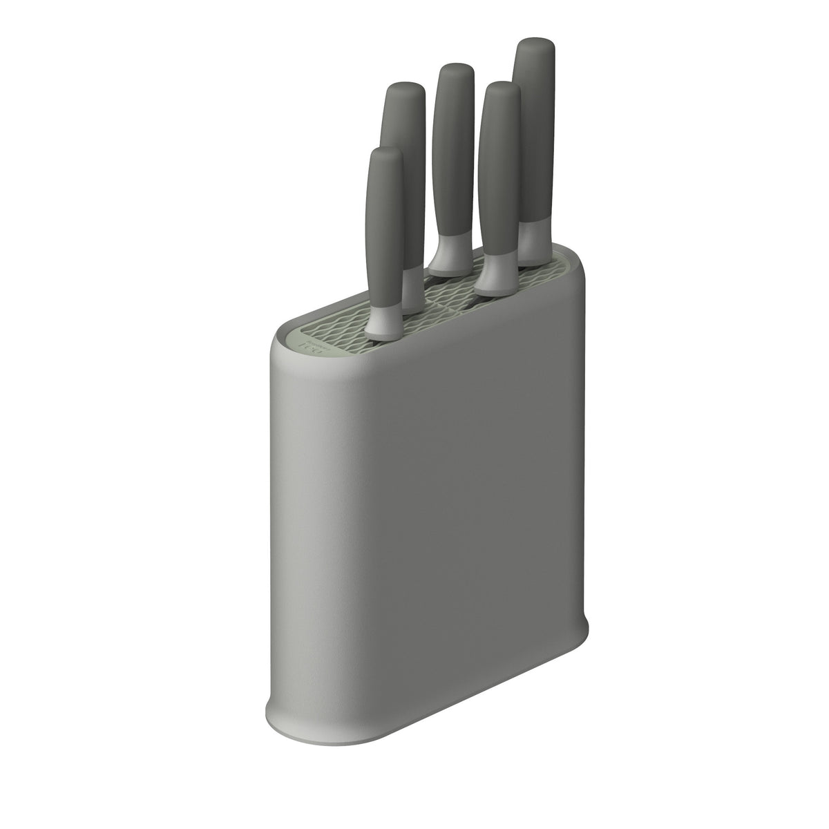 Add an extra touch of green to your kitchen with the recycled plastic used for the knife block and knife handles. Combining modern design with practical features, this 6-piece knife block is a true asset in any kitchen. The block features a non-skid base for secure placement and comes with a two-tone reversible insert so you can switch between grey and sage. Add to this the stainless steel paring knife, vegetable knife, small chef’s knife, chef’s knife and bread knife with a soft-grip handle (and blade with non-stick coating), and you’ll be cutting, slicing and dicing your way around the kitchen in no time!